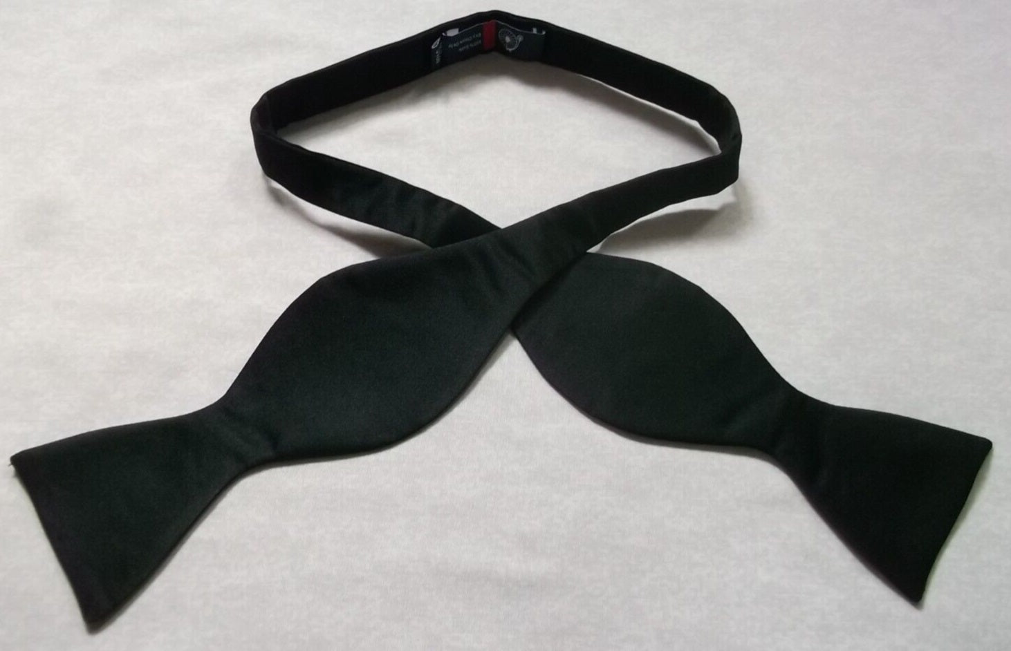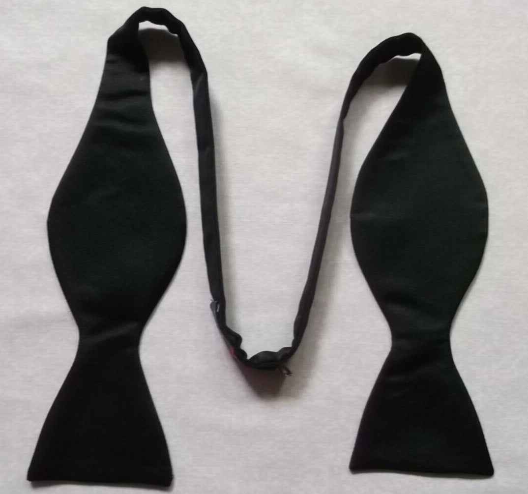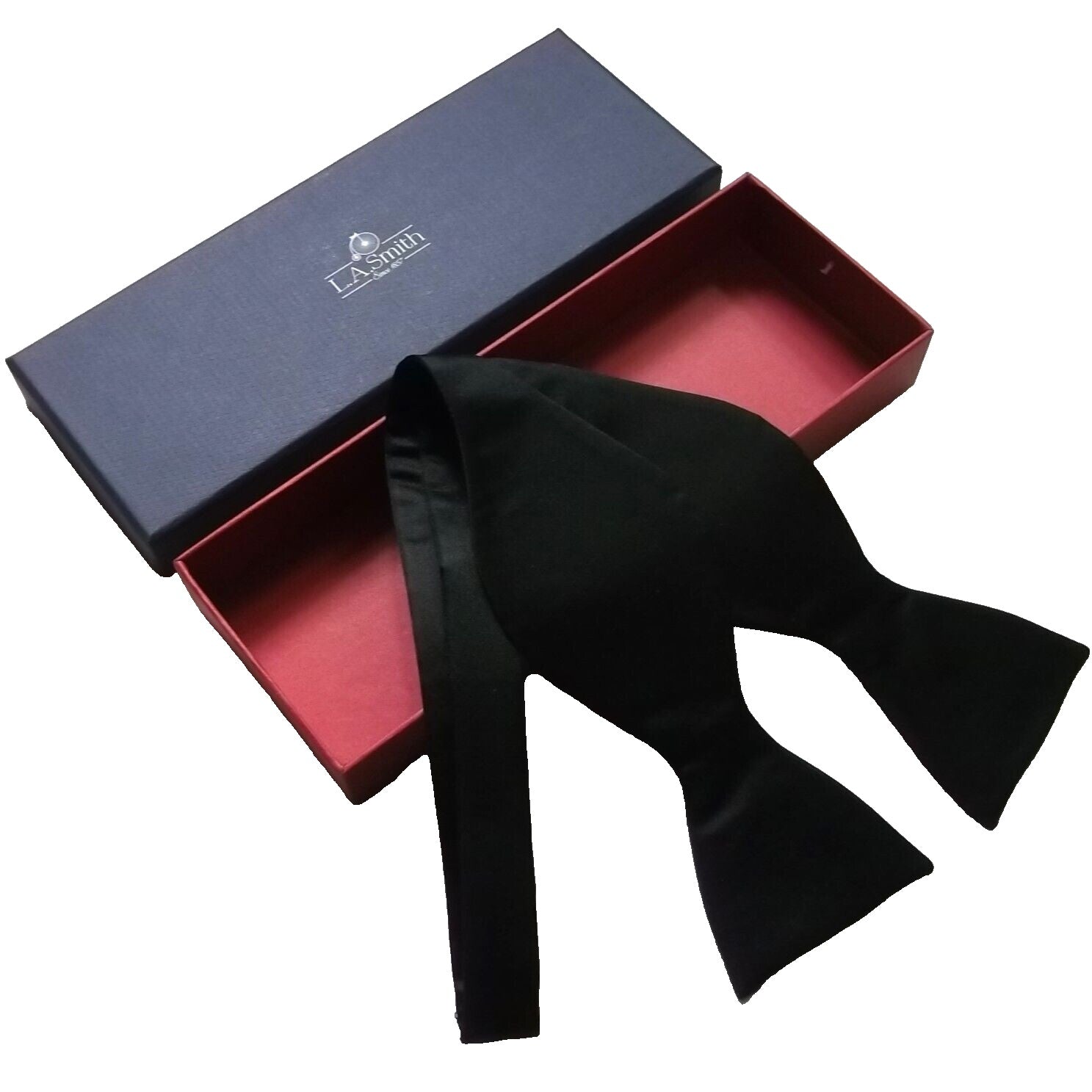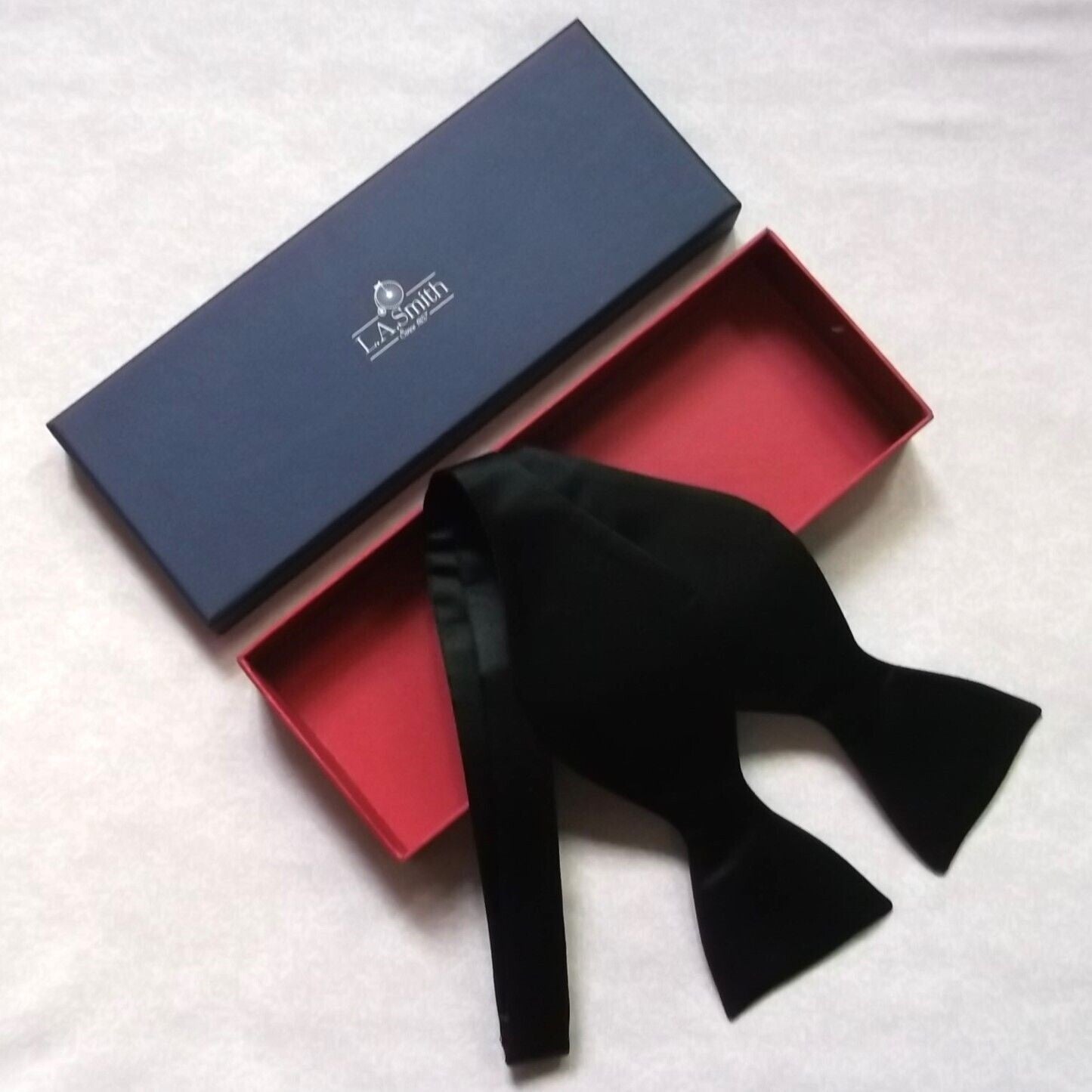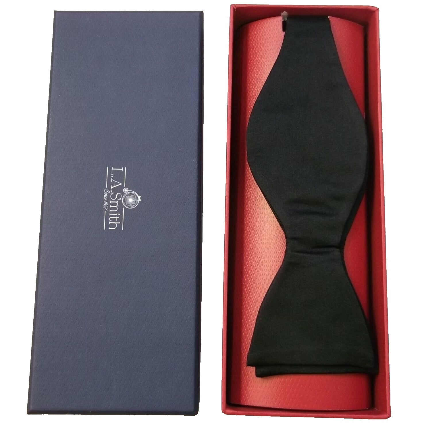 Black pure silk self tie bow tie by L.A. Smith. This self tie bow tie adds a touch of class to your evening ensemble. With an easily adjustable neckband it will fit all collar sizes in seconds.