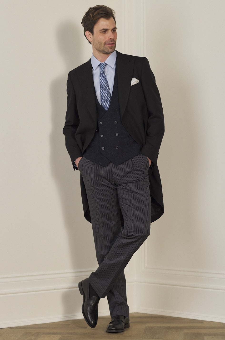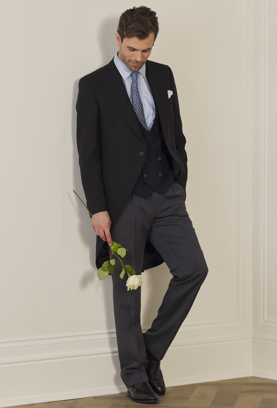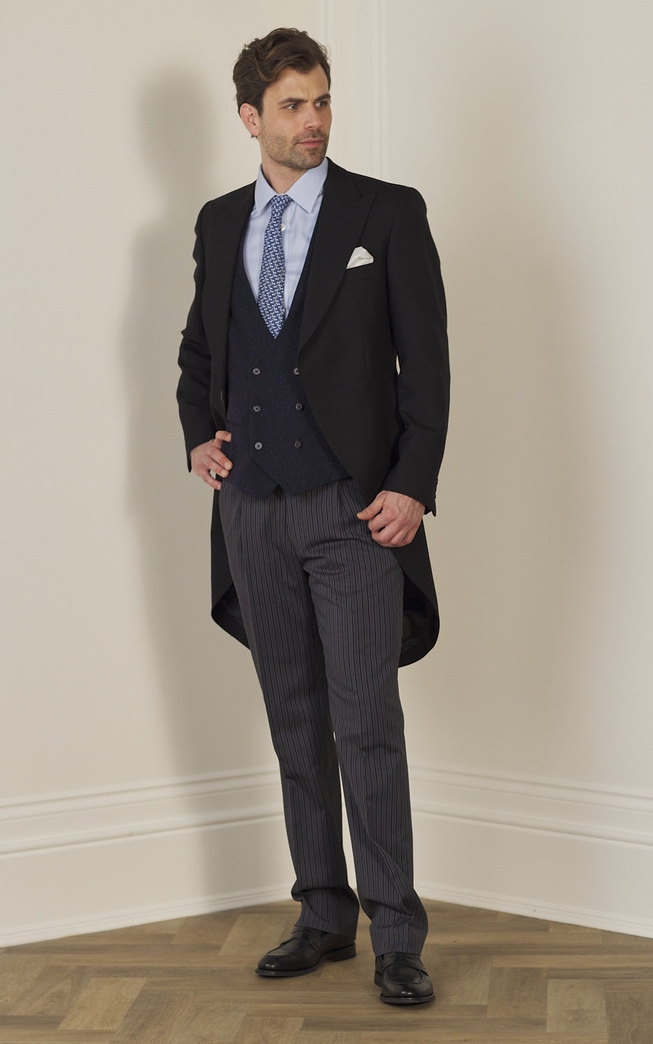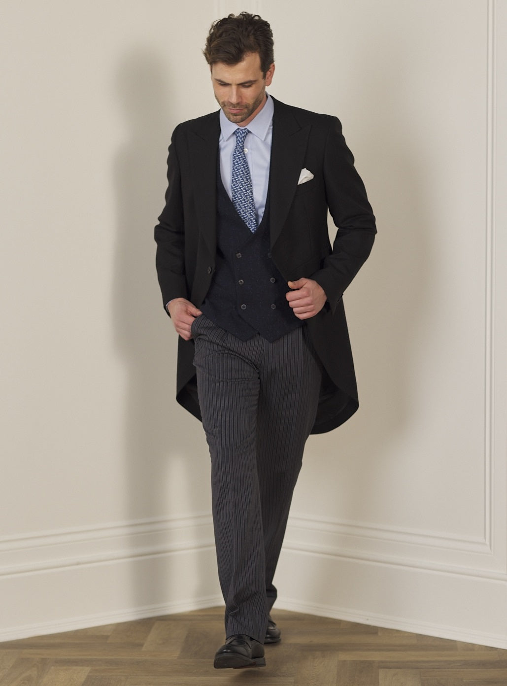 Pair it with a traditional morning trousers and a double breasted waistcoat for a sophisticated look that commands attention. Elevate your style with this timeless morning coat that seamlessly blends tradition with contemporary elegance.